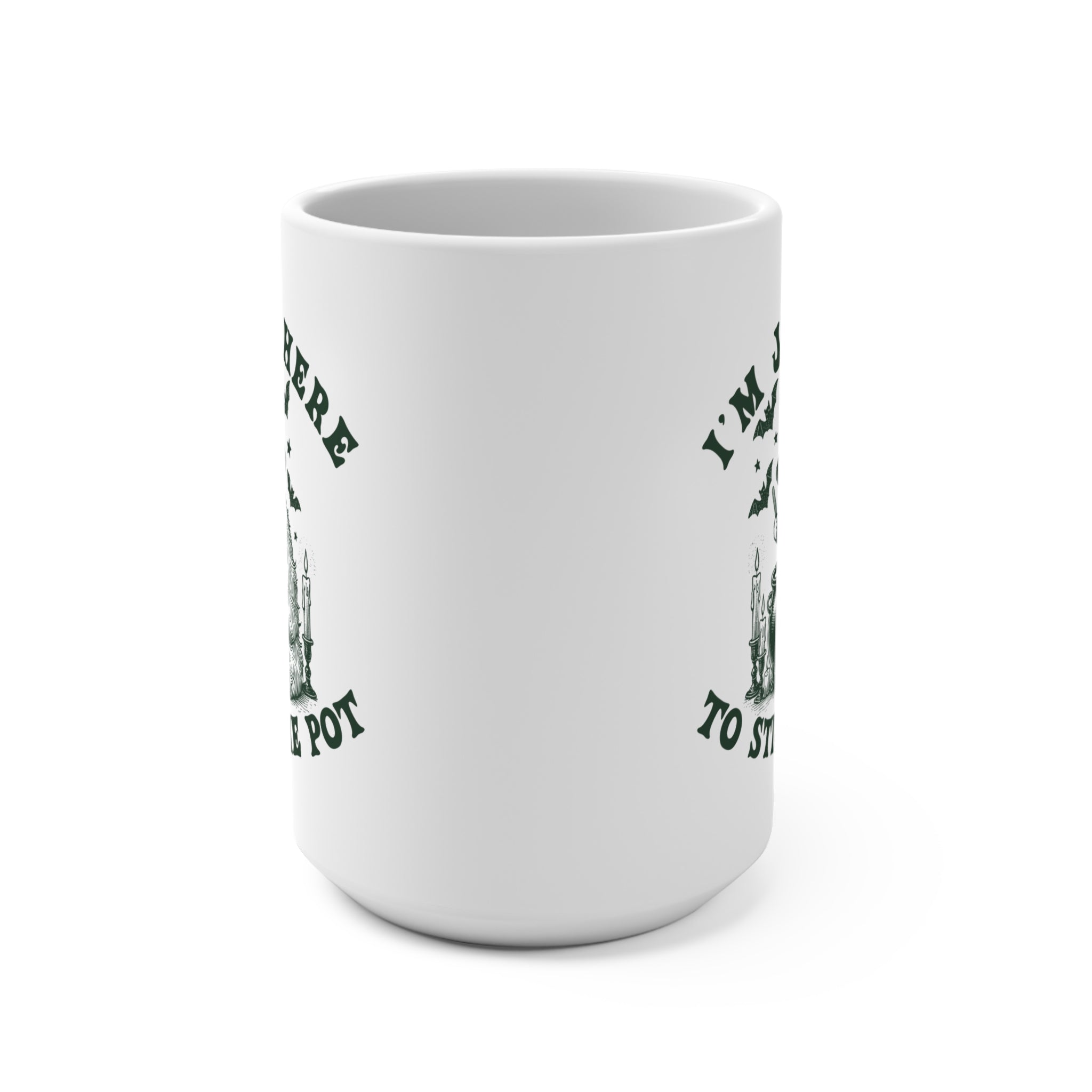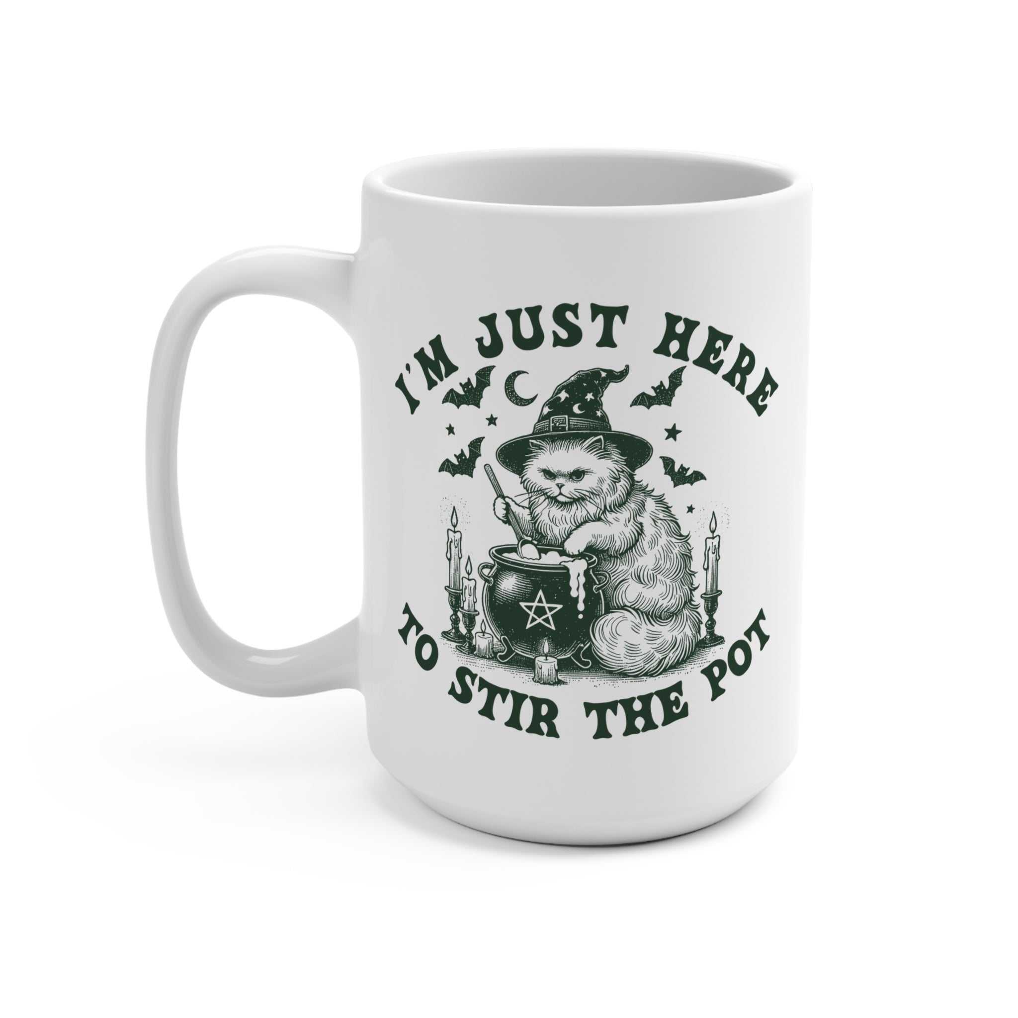 This 15oz white ceramic mug is perfect for cat lovers who enjoy a good laugh. With a funny cat humor design, this mug is ideal for the fall season, Halloween, or anyone who enjoys some pot-stirring. Image is on both sides of the mug. Color if imprint is slightly green